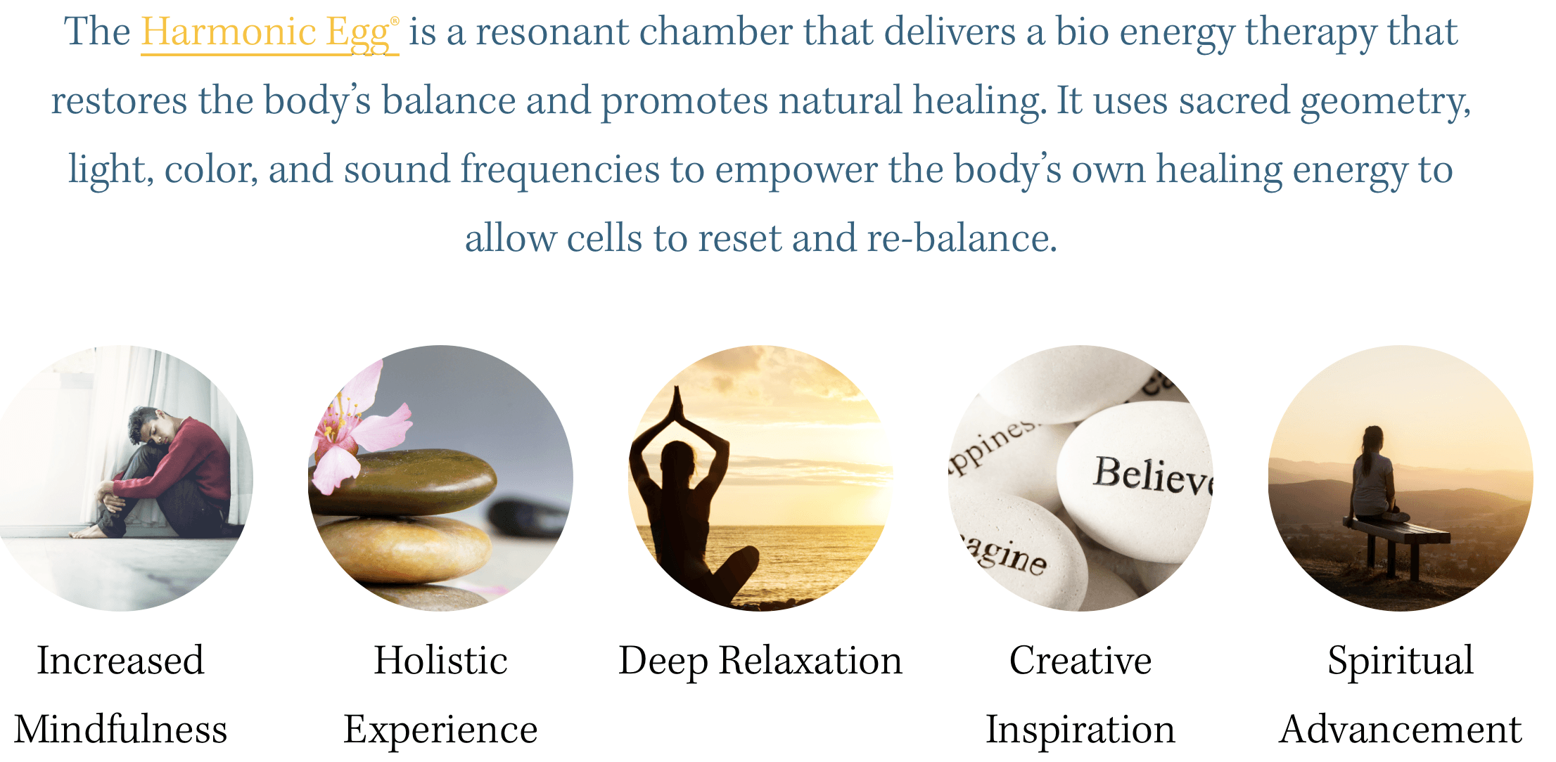 Each session includes a total of 50 minutes inside the Harmonic Egg for: